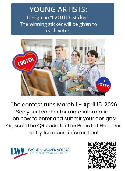 LWVHC is partnering with the Henderson County Board of Education to sponsor the I Voted sticker contest! The winning sticker will be given to every voter in this fall’s general election.